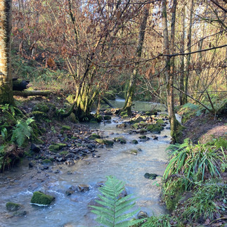 Walking left up Paddockhurst Lane, after a 1/4 a mile or so you take the footpath left past a house and garden (the Oaks), opposite the entrance to Forest Farm. Crossing these fields there are excellent views of the Ghyll valley and the grounds of Wakehurst Place and the ridge of the Ardingly road beyond. Following the path round the field you enter Fire Wood and then go steeply down the rocky and muddy path to Horse Bridge close to where the two streams join to become the Ardingly Brook.