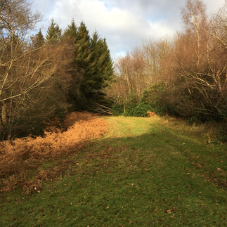 with oak and hazel - under bigger oaks on either side of vale. As he had started on his return from the camp up the Ghyll he could see "half way up far side" grass fields "one with brown bracken lying in rows on slope". This was Bloomer's Valley, an ancient meadow and part of the Wakehurst Estate.